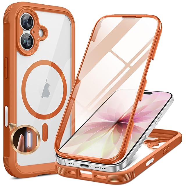 Miracase iPhone17 ケース MagSafe対応 スマホケース いPhone17 用 カバー 9H 強化ガラス 360°保護 全身バンパー保護ケース 6.3インチ フルカバー ワイヤレス充電対応 マグセーフ対応 マグネット搭載 オレンジ