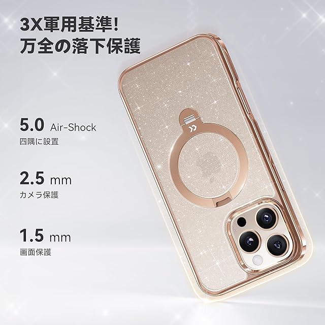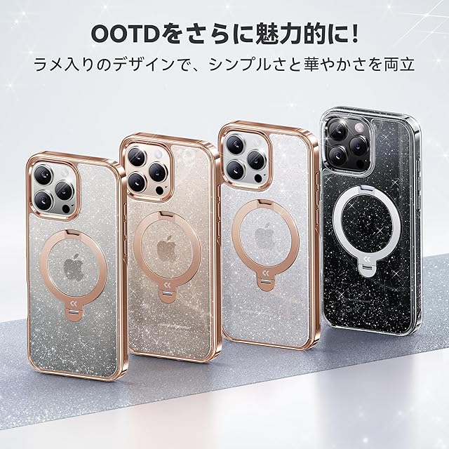 商品名:【極上の透明感・360°全方向スタンド】CASEKOO iPhone 16 Pro 用ケース ラメ仕上げ クリア 耐黄変 横縦両立 角度自在 MagSafe対応 米軍規格保護 耐衝撃 高耐久性 超強磁力 最大25W急速充電対応 フィット感 ラップホール付き 透明 いphone16pro 用ケース 6.3インチ「MagicStand Pro Glitter」(ラメ入りゴールド)