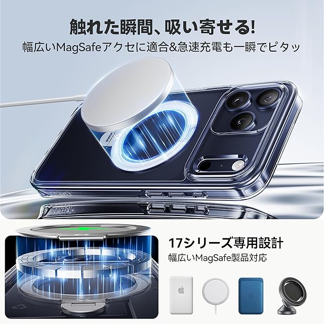 【MagSafe対応を極めた、業界最強18N磁力】新型iPhone 17シリーズに合わせた専用設計で、装着した瞬間からモバイルバッテリー・ウォレットなどのMagSafe対応製品がぴたり。位置合わせ不要で、誰でもすぐに使いこなせる。n58グレード磁石を特許取得済みのHalbach配列で配置し、18Nの業界最高レベルの吸着力を実現。車載ホルダーでもズレず、バイクや自転車ナビの激しい振動にも安心対応。急ブレーキにも強く、ナビも安定して視認可能。最大25Wの高速ワイヤレス充電に対応し、冷蔵庫やロッカーに貼ってレシピ確認や動画視聴も快適。高級感ある仕上がりで、実用品としての満足度も高く、贈り物にも選ばれている逸品。※鉄含有率や設置面の素材によって磁力が弱まる場合があります。対応機種:いphone17pro ケース MagSefe対応