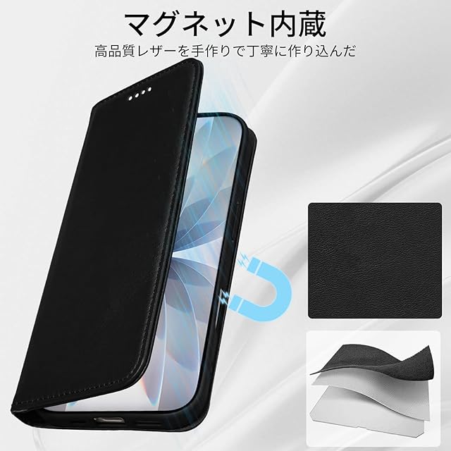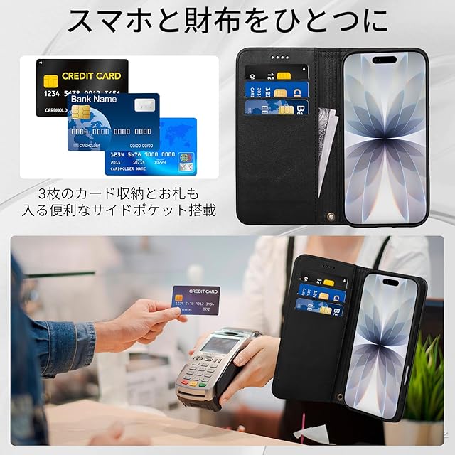 カード収納:アイフォン 17 用 手帳型ケースの内側には便利なカードポケットを搭載。クレジットカードやID、名刺などをまとめて収納でき、財布いらずで外出可能。なお、カードポケットの裏地につける布はRFIDブロッキングライニングを採用しています。ICカードの情報や個人情報などを守ります。※:収納枚数やカードの厚みによっては、蓋が閉まらない場合がありますのでご了承ください。