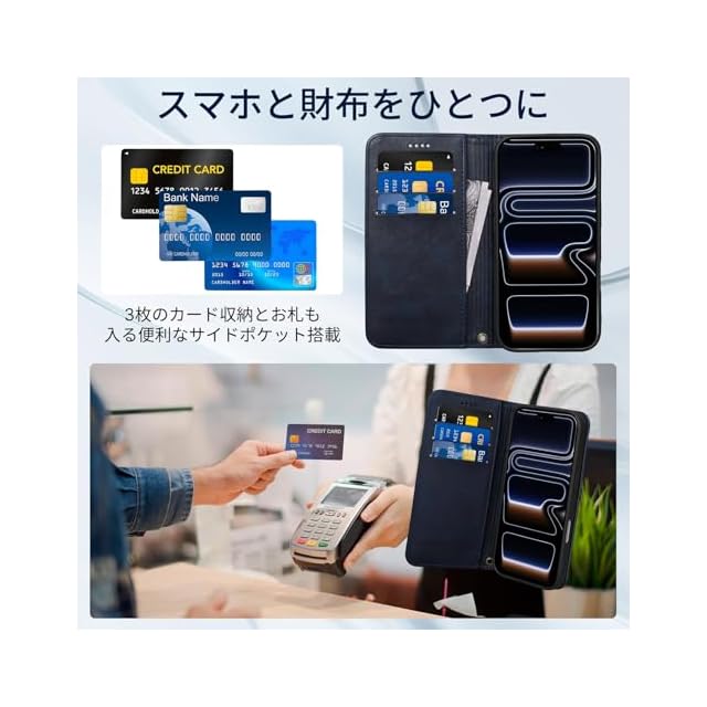 カード収納:アイフォン 17 プロ用 手帳型ケースの内側には便利なカードポケットを搭載。クレジットカードやID、名刺などをまとめて収納でき、財布いらずで外出可能。なお、カードポケットの裏地につける布はRFIDブロッキングライニングを採用しています。ICカードの情報や個人情報などを守ります。※:収納枚数やカードの厚みによっては、蓋が閉まらない場合がありますのでご了承ください。