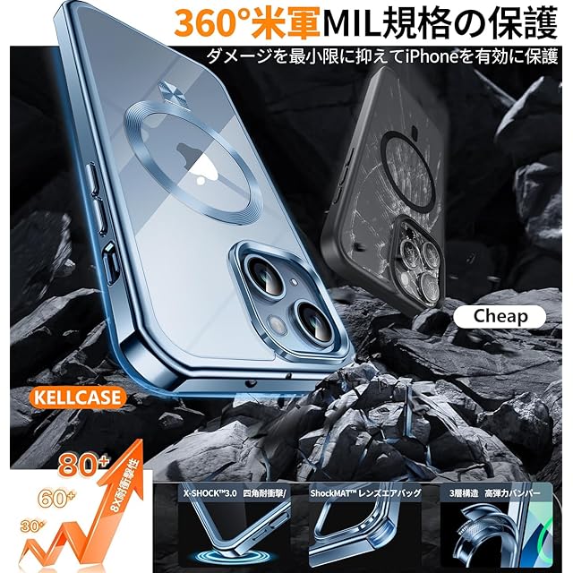 商品名:【360°全面保護・スタンド・Magsafe対応】KELLCASE iPhone 13 用 ケース 両面 隠しスタンド・CDリング 横縦両立 ワイヤレス充電 いphone13 カバー 黄変防止透明PC背面 メッキバンパー 米軍MIL規格耐衝撃 マグセーフ対応 高感度タッチ ストラップホール付き アイフォン13 用 ケース 6.1インチ (シエラブルー)