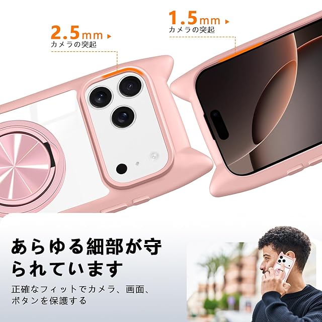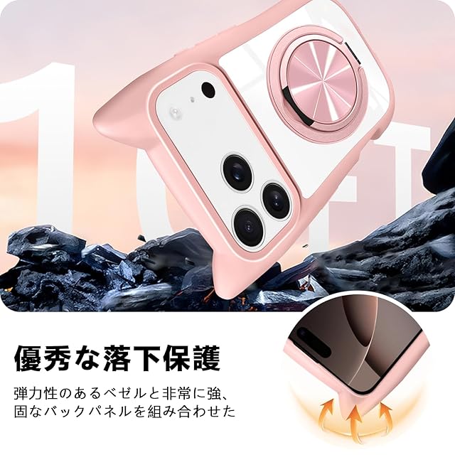 商品名:iPhone 17 Pro Max 用 ケース クリア MagSafe対応 360度回転スタンド リング付き ハイブリッド 猫耳 ネコミミ iphone 17 pro max カバー PC背面 + TPUバンパー 透明 いphone 17 pro max カバー ワイヤレス充電 ネック ショルダー 磁気リング マグネット搭載 耐衝撃 米軍MIL規格取得 落下防止 (ピンク)