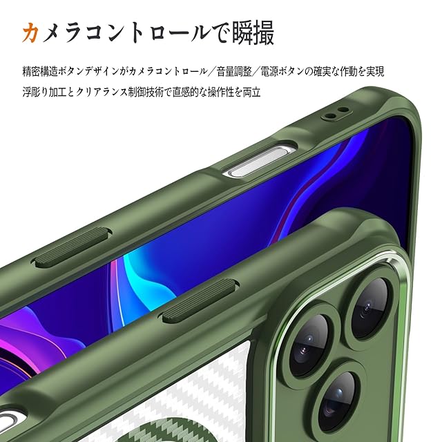商品名:Panda Baby iPhone 17 Pro Max 用 ケース MagSafe対応 半透明 マット質感 指紋防止 耐衝撃バンパー マグネット搭載 レンズ全面保護 「おしゃれなカーボン調」 (グリーン)