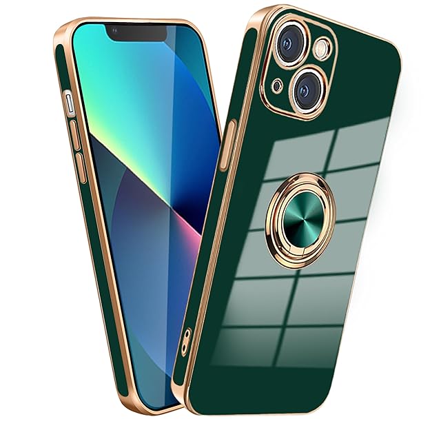 MiaoKeDa iPhone 13 ケース リング 耐衝撃 いphone13 リング付き スマホケース TPU 車載ホルダー ストラップホール付き メッキ加工 カバー ダークグリーン