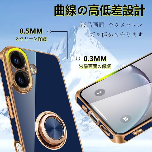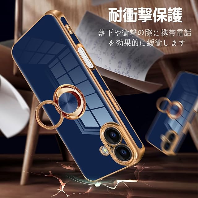 商品名:MiaoKeDa iPhone 16 Plus ケース リング 耐衝撃 いphone16Plus リング付き スマホケース TPU 車載ホルダー ストラップホール付き メッキ加工 カバー ネイビーブルー