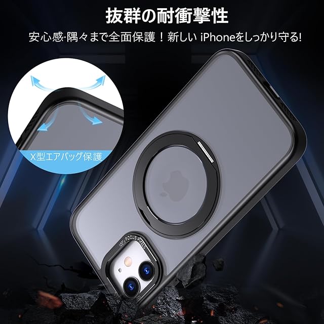 KWATUNG iPhone12 用 ケース iPhone 12 Pro 用 スマホケース magsafe対応 ワイヤレス充電 耐衝撃 いpほね12 用 ケース 360°回転スタンド 縦横両対応 アイフォン12用カバー マグネット搭載 防指紋 米軍MIL規格 スマホケース iphone12/iPhone12 Pro 用 6.1インチ 半透明 マット感 ブラック