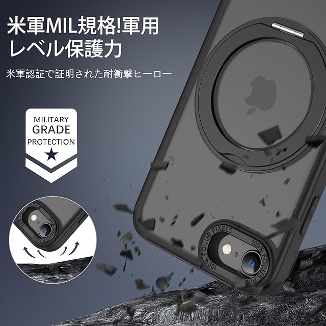 <b>特徴:</b><br> <b>MagSafe対応の超強磁力:</b><br> 様々な状況下でも安定した充電を実現し、MagSafeバッテリー、カードケース、ワイヤレス充電器、リング、車載スタンドなど、多様なMagSafeアクセサリに対応。<br><br> <b>360°回転スタンド:</b><br> 便利な隠れスタンドはケースと一体型になり、360°回転できる機能により、横起きあるいは縦起きはもちろん、絶妙なデザインで携帯を自由に多角度を調節でき、力よくスマホを支えて、映像や読書などに楽しめることができます。<br> 使わない時はスマートに収めるから邪魔にならない。<br><br> <b>半透明の高級感と美しさ:</b><br> iPhoneの背面の透け通る美しさを演出する半透明デザインは、かっこいいリンゴロゴを巧みに浮かべ、高級感を演出します。<br><br> <b>高品質素材と全面保護:</b><br> 背面に高級なハードPC素材を採用し、側面にTPU素材を使います。カメラ周りのエッジは、レンズの傷や汚れを効果的に防止します。<br><br> <b>規格:</b><br> 対応デバイス:iPhone SE3/SE2/8/7<br> 材質:TPU+ポリカーボネート<br> 色:ブラック<br><br> <b>質問と回答:</b><br> <b>質問1:このケースはiPhone SE3 /iPhone SE2 /iPhone 8 /iPhone 7専用ですか、それとも他のiPhoneモデルにも対応していますか?</b><br> 回答1:このケースはiPhone SE3 /iPhone SE2 /iPhone 8 /iPhone 7専用に設計されています。しかし、iPhone6、iPhone6Sモデルにも対応します。<br><br> <b>質問2:この iPhone SE3/SE2 /iPhone 8/7 ケースはMagSafe技術に対応していますか?ワイヤレス充電速度に影響はありますか?</b><br> 回答2:はい、このケースはMagSafe技術に完全に対応しており、ワイヤレス充電速度に影響を与えることはありません。<br><br> <b>質問3:このケースの衝撃吸収性能はどの程度ですか?落下時のダメージを防ぐことができますか?</b><br> 回答3:高品質な素材とにより、この iPhone SE3/SE2 /iPhone 8/7 ケースは抜群の耐衝撃性を持っており、落下時のダメージを効果的に防ぐことができます。<br><br>