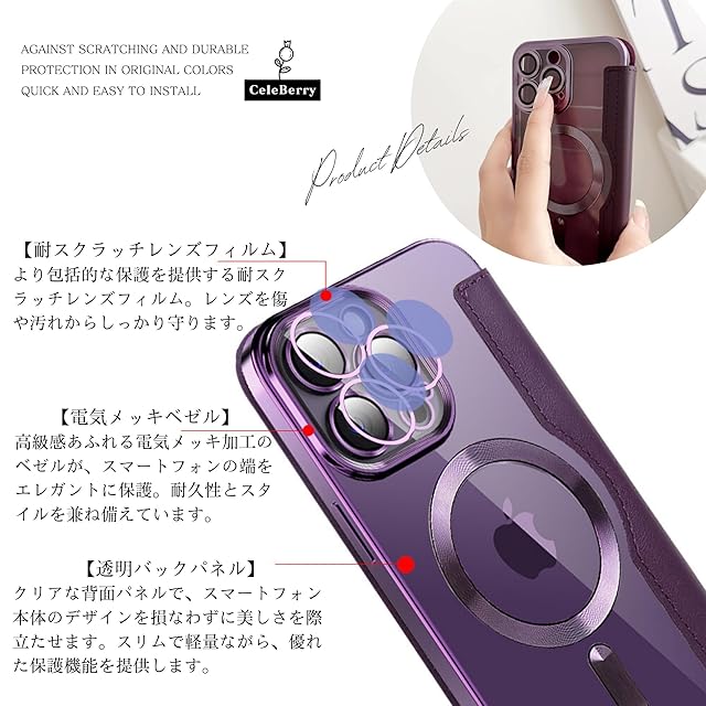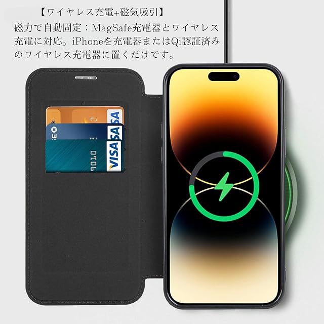 高品質PUレザーとTPU素材を使用し、MagSafe対応で洗練されたデザインと機能性を兼ね備えた手帳型ケース。