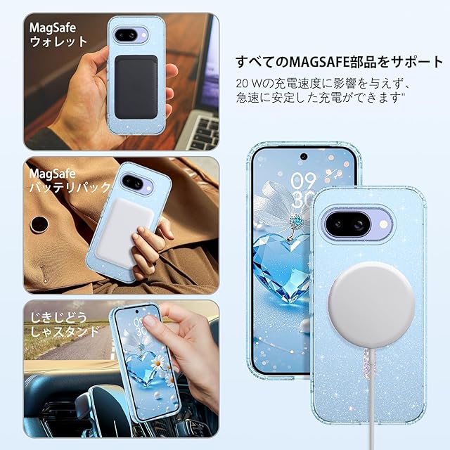 商品名:YINLAI Google Pixel 9a 6.3インチ 専用 ケース カバー ラメ グリッター ブルー 水色 クリア |耐衝撃 マグセーフ対応 マグネット式 |ワイヤレス充電 完全対応 & 米軍MIL規格 |黄ばみ防止 美しさ 長持ち きらきら キラキラ ブリンブリン かわいい|軽量 薄型 スマホケース 女性向け