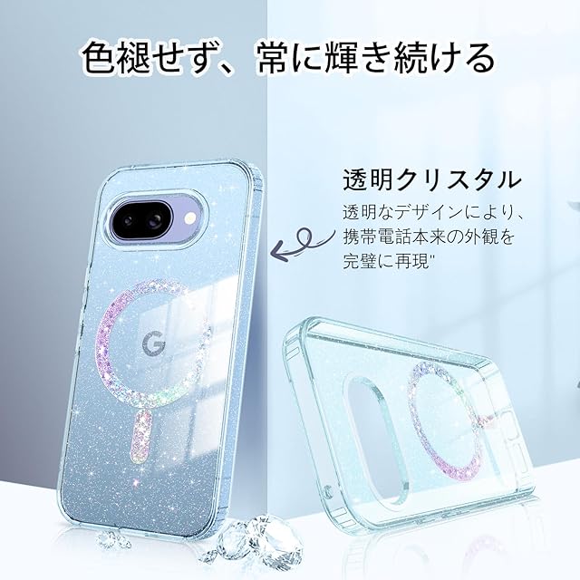 【キラキラ輝く・クリアデザイン】透明な TPU+PC 素材にキラキラ粒子を封入して、Google Pixel 9a の本体色を最大限に活かしつつ、華やかさを追加します。光の角度で変化する キラキラ効果 が、普段使いも特別な日に持ちたい、かわいいスマホケースに変身します。黄ばみ防止加工で長期使用も透明美持続します。