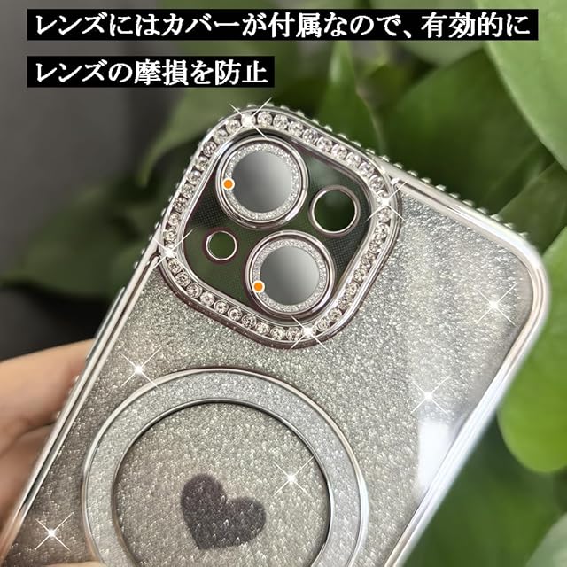 YUYIB スマホケース 対応 iPhone 13 ケース MagSafe対応 クリア メッキ加工 ドリル ハートシール きらきら ブリンブリン かわいい おしゃれ 軽量 薄型 衝撃吸収 女性 ストラップ穴あり アイフォン13 磁気ケース (シルバー, iPhone 13)