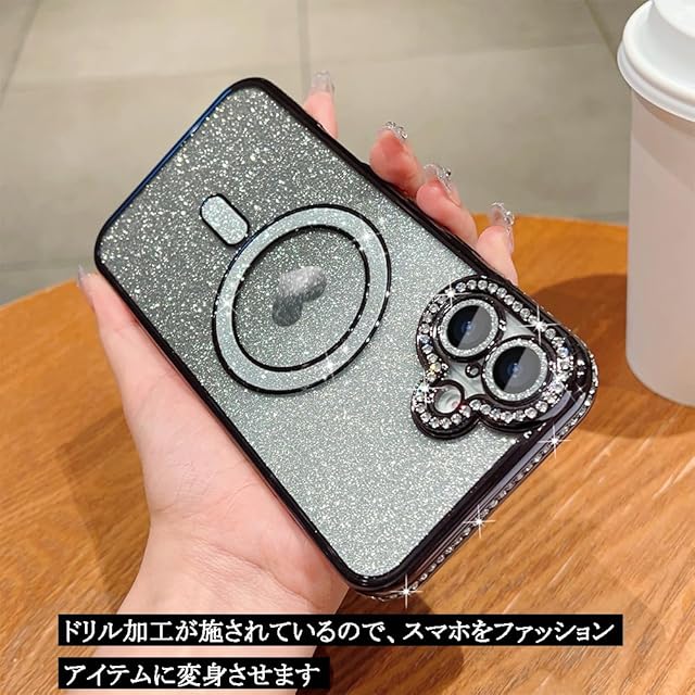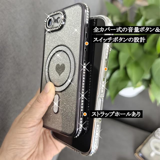 商品名:YUYIB スマホケース 対応 iPhone 16 ケース MagSafe対応 クリア メッキ加工 ドリル ハートシール きらきら ブリンブリン かわいい おしゃれ 軽量 薄型 衝撃吸収 女性 ストラップ穴あり アイフォン16 磁気ケース (ブラック, iPhone 16)
