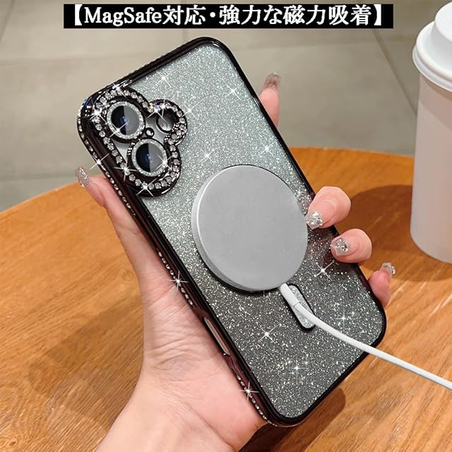 商品名:YUYIB スマホケース 対応 iPhone 16 Plus ケース MagSafe対応 クリア メッキ加工 ドリル ハートシール きらきら ブリンブリン かわいい おしゃれ 軽量 薄型 衝撃吸収 女性 ストラップ穴あり アイフォン16プラス 磁気ケース (ブラック, iPhone16 Plus)