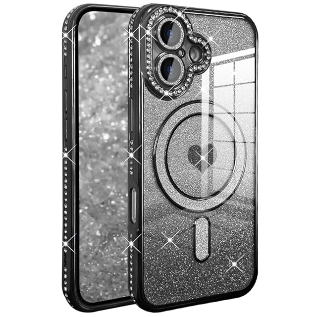 YUYIB スマホケース 対応 iPhone 16 Plus ケース MagSafe対応 クリア メッキ加工 ドリル ハートシール きらきら ブリンブリン かわいい おしゃれ 軽量 薄型 衝撃吸収 女性 ストラップ穴あり アイフォン16プラス 磁気ケース (ブラック, iPhone16 Plus)