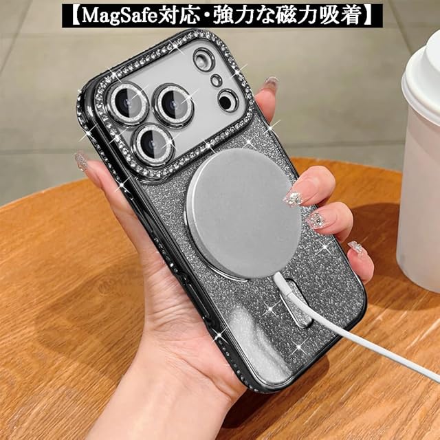 商品名:YUYIB スマホケース 対応 iPhone 17 Pro ケース MagSafe対応 クリア メッキ加工 ドリル ハートシール きらきら ブリンブリン かわいい おしゃれ 軽量 薄型 衝撃吸収 女性 ストラップ穴あり アイフォン17プロ 磁気ケース (ブラック)