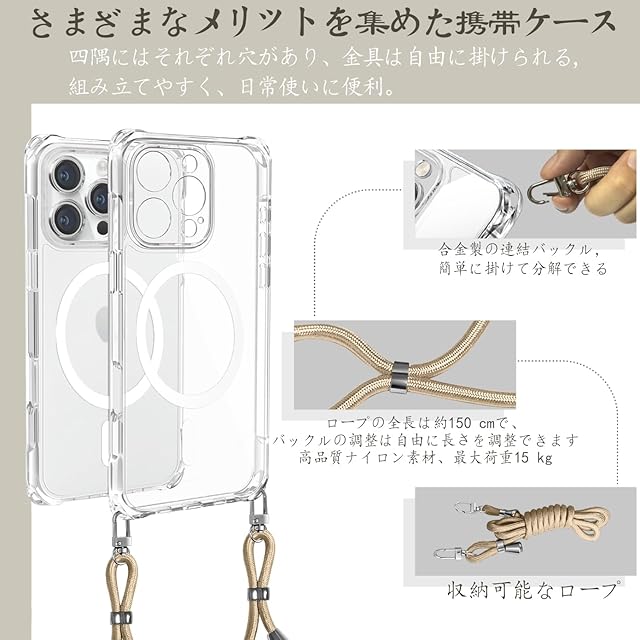 商品名:iPhone 16 Pro Max 用 ケース クリア ショルダー MagSafe対応 耐衝撃 iPhone16ProMax スマホケース マグセーフ対応 透明 織りストラップ付き アイフォン16 Pro Max カバー 肩がけ 首掛け 紐付き 縄掛け シングルショルダーロープ 斜めがけ 調節可能なショルダー クロスボディ 多目的キャリー ファッションデザイン TPUスマホ(ゴールド)