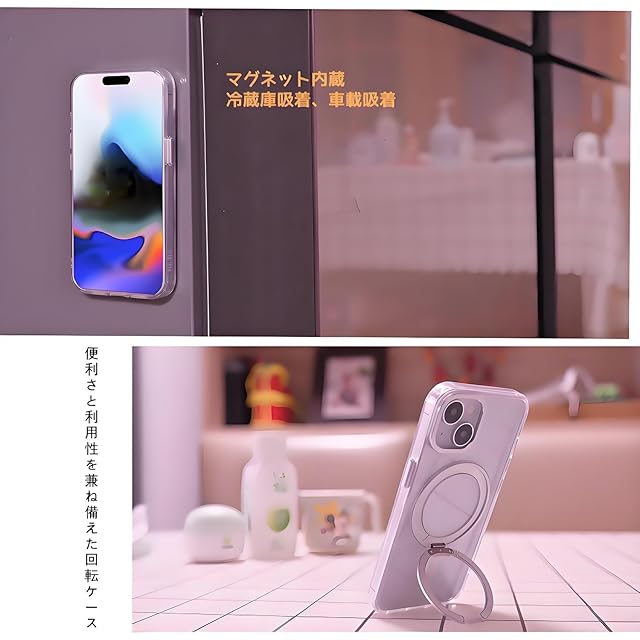 「360°Magsafe対応スタンド&ワイヤレス充電」リング丸には磁石のマグセーフ搭載、アイフォン14ケース装着時の磁力がアップし、MagSafe式の充電器やアクセサリとの安全なロックがされます。差し込みのいらないより簡単により素早く充電できます。