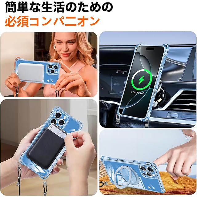 商品名:iPhone 15 Pro 用 ケース クリア 縦横両対応 360°回転スタンド リング マグネット搭載 MagSafe対応 ワイヤレス充電対応 いphone15 pro ケース 肩掛け 斜めかけ 縄掛けケース 透明 tpu メッキ加工 耐衝撃 車載ホルダー 対応 ストラップ穴付き アイフォン 15 pro カバー