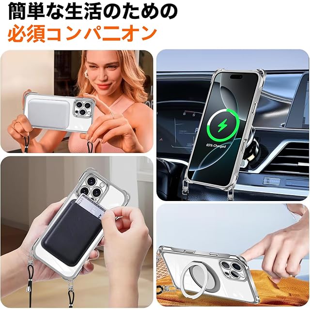商品名:iPhone 15 Pro Max 用 ケース クリア 縦横両対応 360°回転スタンド リング マグネット搭載 MagSafe対応 ワイヤレス充電対応 肩掛け 斜めかけ 縄掛けケース 透明 tpu メッキ加工 耐衝撃 車載ホルダー 対応 ストラップ穴付き アイフォン 15 pro max カバー