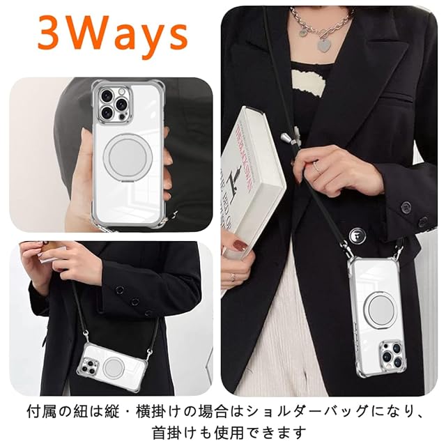 iPhone 15 Pro Max 用 ケース クリア 縦横両対応 360°回転スタンド リング マグネット搭載 MagSafe対応 ワイヤレス充電対応 肩掛け 斜めかけ 縄掛けケース 透明 tpu メッキ加工 耐衝撃 車載ホルダー 対応 ストラップ穴付き アイフォン 15 pro max カバー