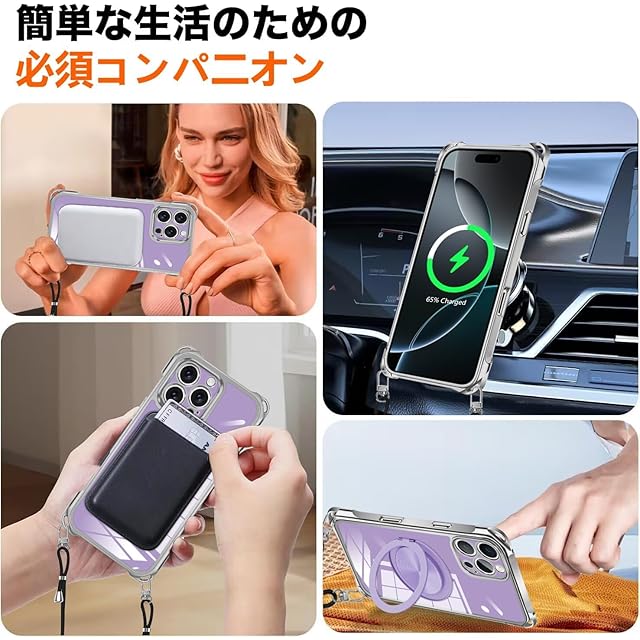 商品名:iPhone 17 Pro Max 用 ケース クリア 縦横両対応 360°回転スタンド リング マグネット搭載 MagSafe対応 ワイヤレス充電対応 いphone17 pro max ケース 肩掛け 斜めかけ 縄掛けケース 透明 tpu メッキ加工 耐衝撃 車載ホルダー 対応 ストラップ穴付き アイフォン 17 pro max カバー