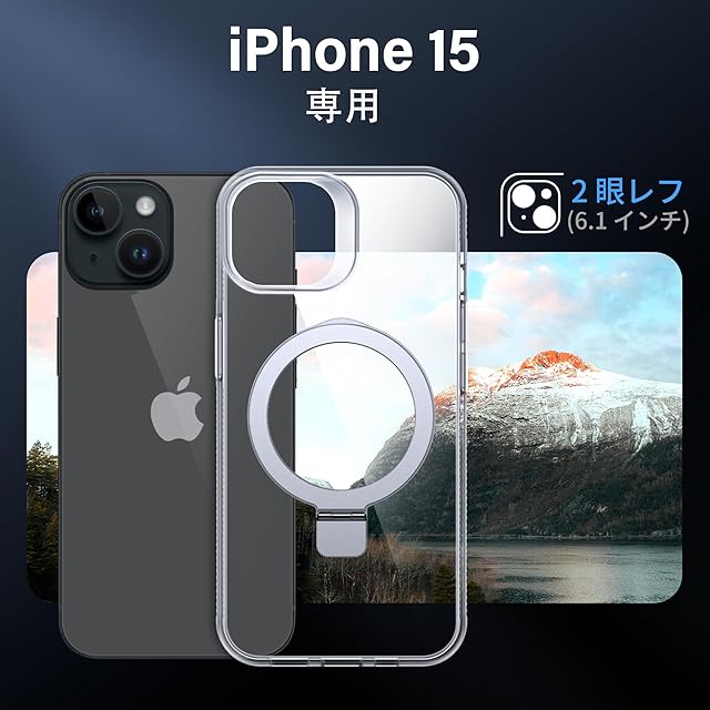 【隠しスタンド&リング・MagSafe対応】独自の隠しスタンドとリングデザインにより、iPhone 15を横向きや縦向きで安定して立てることができ、映画視聴やビデオ通話に便利です。また、MagSafe対応で、ワイヤレス充電器やMagSafeアクセサリーとの互換性が高いのも大きな魅力です。
