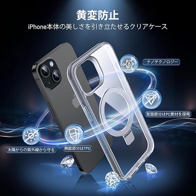 商品名:【隠しスタンド リング・MagSafe対応】Flyzooケース用のiPhone 15 [ワイヤレス充電対応 多機能一体] クリアで透明な 黄ばみ防止 米軍MIL規格 耐衝撃 高耐久性 傷つけ防止 滑り止めグリップ マグネットホルダースマホ保護カバー 6.1インチ(クリア)