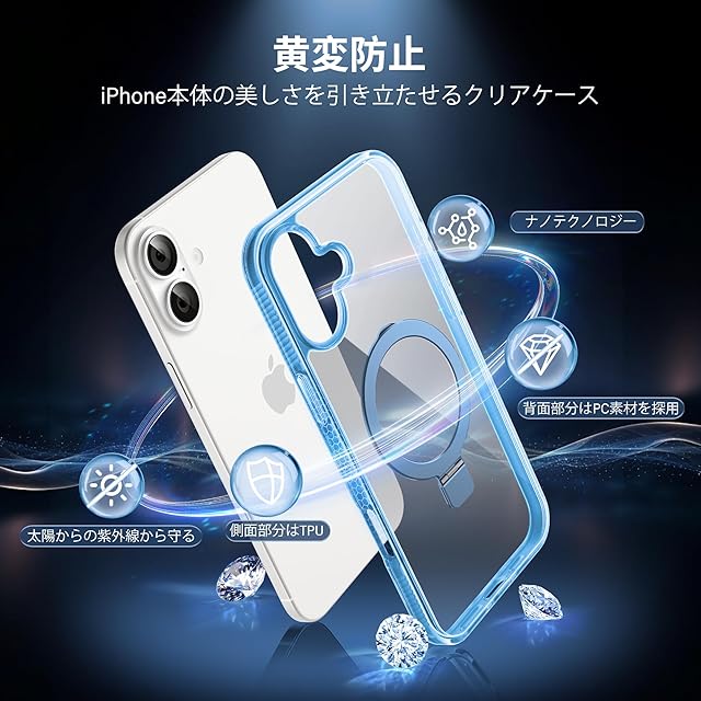商品名:【隠しスタンド リング・MagSafe対応】Flyzooケース用のiPhone 16 [ワイヤレス充電対応 多機能一体] クリアで透明な 黄ばみ防止 米軍MIL規格 耐衝撃 高耐久性 傷つけ防止 滑り止めグリップ マグネットホルダースマホ保護カバー 6.1インチ(ブルー)