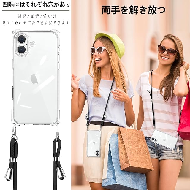 商品名:iPhone 16 Plus 用 ケース ショルダー クリア アイフォン16Plus スマホケース 肩掛け 斜めかけ 縄掛けケース 透明 薄型 軽量 TPU 携帯ケース 紐付き 斜めがけ 織りストラップ付き 長さ調整可能 取り外し可能 落下防止 紛失防止 (ブラック)