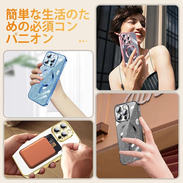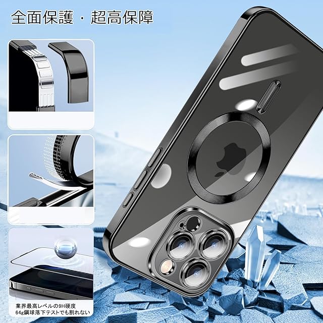 商品名:iPhone 15 Pro 用 ケース クリア MagSafe対応 マグネット搭載 2枚 HDフィルム付き キラキラ グリッターカード ストラップ付き アイフォン 15 プロ カバー マグセーフ対応 薄型 軽量 レンズ保護 全面保護 耐衝撃(ブラック)