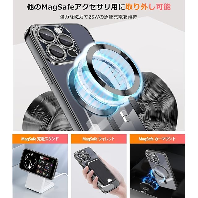 「Magsafe対応」ケースをつけたままマグセーフ機能を快適に使用できます。背面に薄くて強いマグネット内蔵しています、ワイヤレス充電や車載ホルダーやアクセサリとのあらゆる充電に安定で接着ができ、差し込みのいらないより簡単により素早く充電できます。