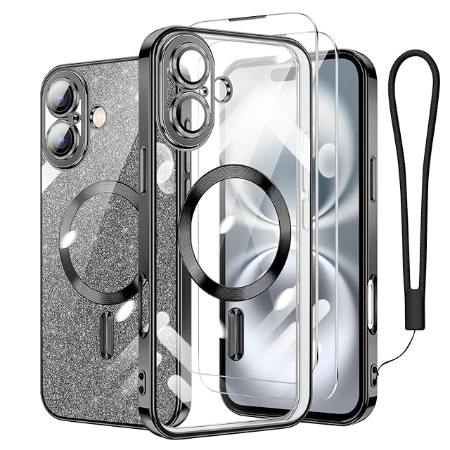 iPhone 16 用 ケース クリア MagSafe対応 マグネット搭載 2枚 HDフィルム付き キラキラ グリッターカード ストラップ付き アイフォン 16 カバー マグセーフ対応 薄型 軽量 レンズ保護 全面保護 耐衝撃(ブラック)