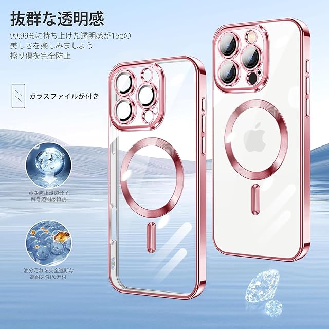 商品名:iPhone 16 Pro 用 ケース クリア MagSafe対応 マグネット搭載 2枚 HDフィルム付き キラキラ グリッターカード ストラップ付き アイフォン 16 プロ カバー マグセーフ対応 薄型 軽量 レンズ保護 全面保護 耐衝撃(ピンクゴールド)
