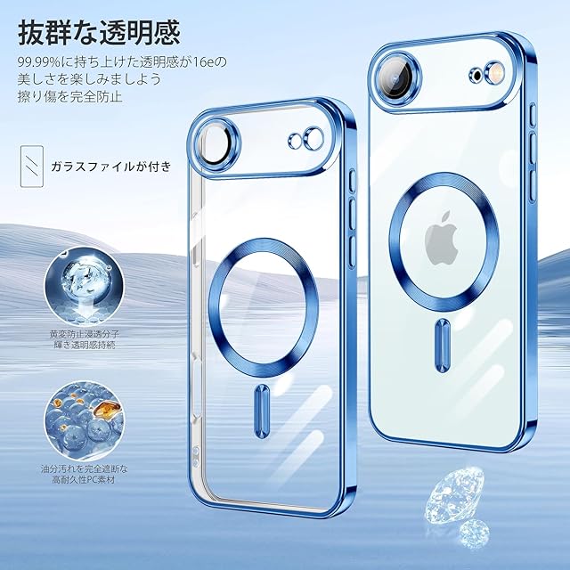 商品名:iPhone air 用 ケース クリア MagSafe対応 ワイヤレス充電 マグネット搭載 2枚 HDフィルム付き キラキラ グリッターカード ストラップ付き アイフォン Air カバー マグセーフ対応 薄型 軽量 レンズ保護 全面保護 耐衝撃(ブルー)
