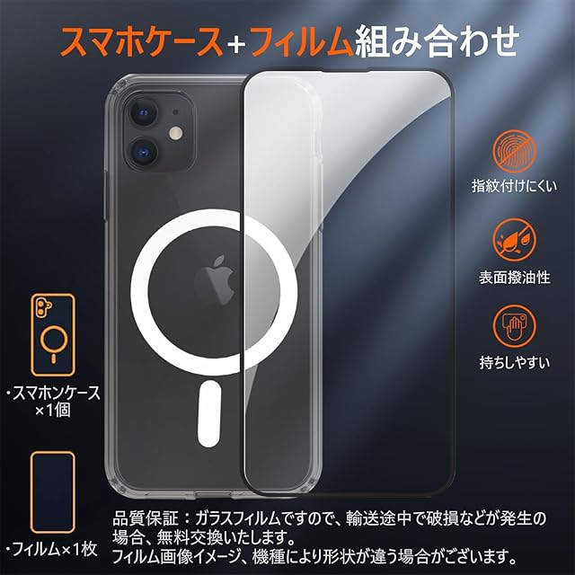 商品名:MagSafe対応 iPhone 12 ケース クリア ガラスフィルム付き 透明 マグネット搭載 アイフォン 12 ケース PC+TPU 滑り止め 指紋防止 米軍MIL規格 耐衝撃 耐久性 全面保護 黄ばみなしアイフォンカバー いPhone 12 グセーフ対応 (クリア, iPhone 12)