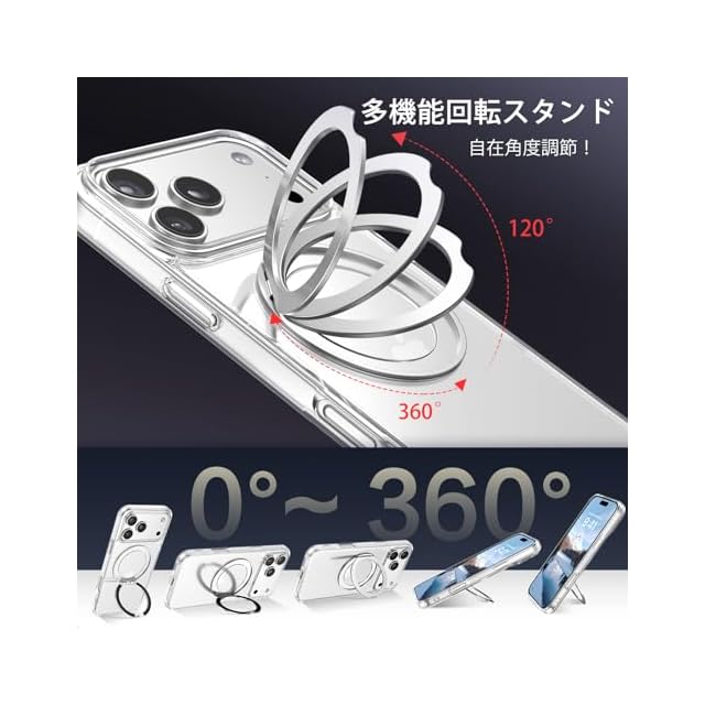 BENTOBEN iPhone 17 Pro対応 ケース クリア MagSafe対応 ワイヤレス充電 360°回転スタンド 縦横両対応 耐衝撃 黄変なし マグネット内蔵 ストラップホール付き iPhone17 Pro対応 ケース カバー クリア