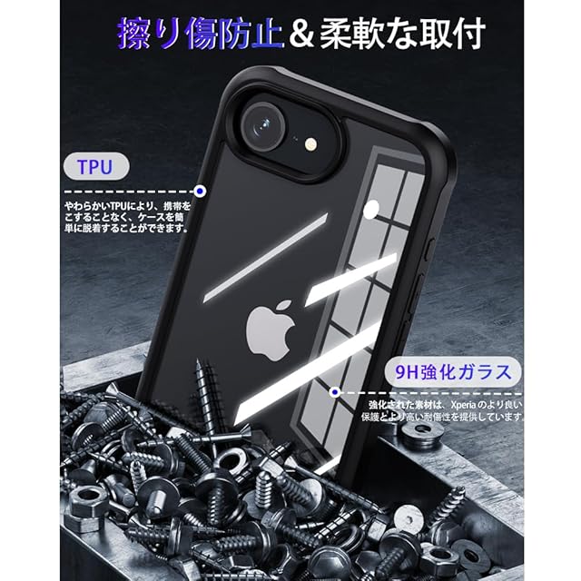iPhone 16e 用 ケース、前面9H強化ガラス+背面透過率99.9%PC素材はスマートフォンを保護し、タッチ感度に影響しません. 金属やマグネットを使用しない高弾性TPUにはスマートフォンの通話信号を全然影響しません。エッジの突起はカメラ保護し、カメラの摩擦を効果的に防止します。四隅に衝撃吸収エアバッグを内蔵して、美観に影響しないと同時に、衝撃吸収と落下防止により優れて、満ちる安全感を与えます。