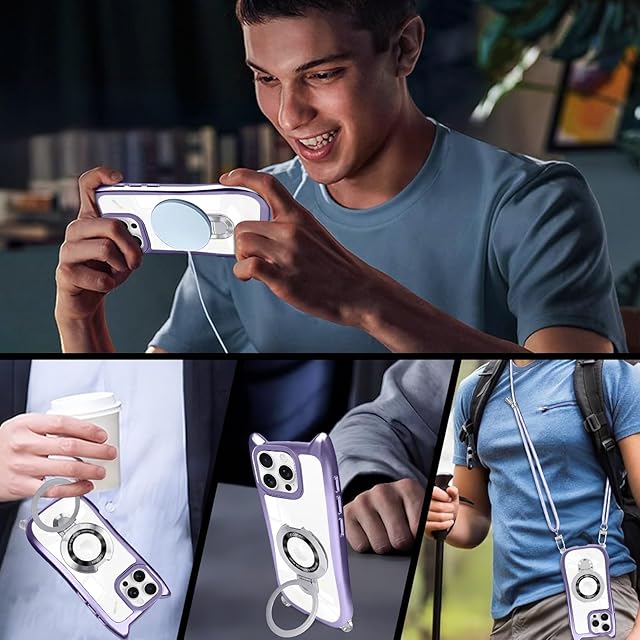 iPhone 16 Pro Max ケース クリア リング付き 猫耳 ネコミミ TPU MagSafe対応 ワイヤレス充電 iphone 16 pro max カバー 透明 アイフォン16 pro max マホケース ネック ショルダー 肩掛け 首掛け 斜めがけ 紐付き 長さ調整可能 韓国 かわいいファッション 耐衝撃 多機能 マグネット搭載 縦横両対応 車載対応 薄型 軽量 落下防止(パープル)