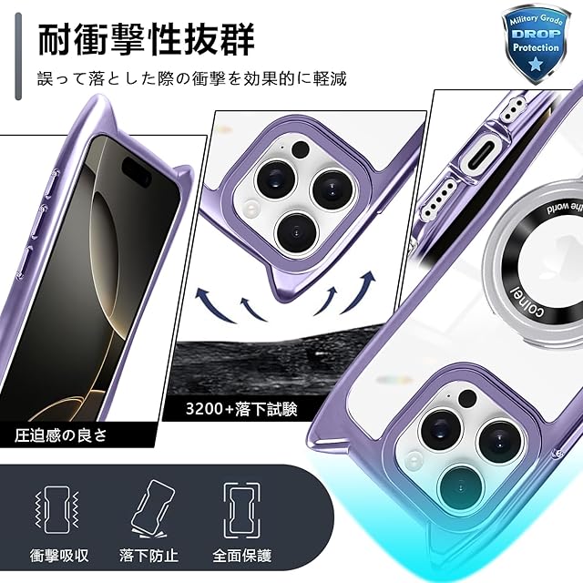 商品名:iPhone 16 Pro Max ケース クリア リング付き 猫耳 ネコミミ TPU MagSafe対応 ワイヤレス充電 iphone 16 pro max カバー 透明 アイフォン16 pro max マホケース ネック ショルダー 肩掛け 首掛け 斜めがけ 紐付き 長さ調整可能 韓国 かわいいファッション 耐衝撃 多機能 マグネット搭載 縦横両対応 車載対応 薄型 軽量 落下防止(パープル)