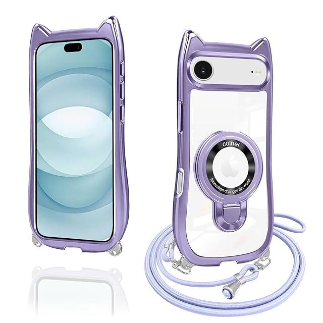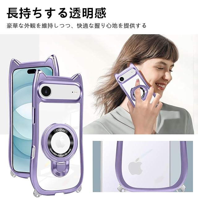 iphone air ケース クリア リング付き 猫耳 ネコミミ TPU MagSafe対応 いphone air ケース ワイヤレス充電 アイフォン air スマホケース 透明 耐衝撃 多機能 マグネット搭載 縦横両対応 車載対応 ネック ショルダー 薄軽型 肩掛け 首掛け 斜めがけ 紐付き 長さ調整可能 韓国 かわいいファッション 落下防止(パープル)