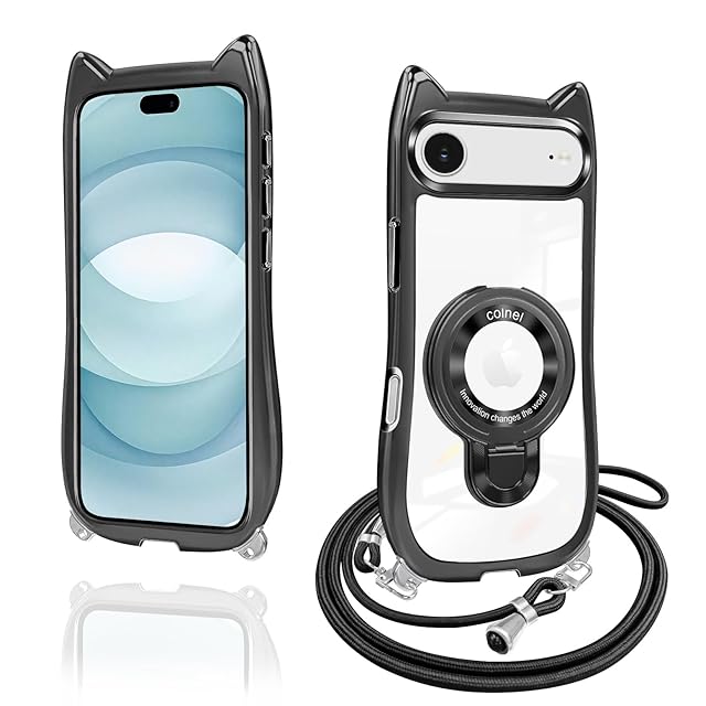 iphone air ケース クリア リング付き 猫耳 ネコミミ TPU MagSafe対応 いphone air ケース ワイヤレス充電 アイフォン air スマホケース 透明 耐衝撃 多機能 マグネット搭載 縦横両対応 車載対応 ネック ショルダー 薄軽型 肩掛け 首掛け 斜めがけ 紐付き 長さ調整可能 韓国 かわいいファッション 落下防止(ブラック)