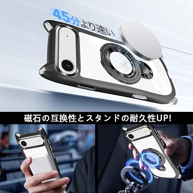 商品名:iphone air ケース クリア リング付き 猫耳 ネコミミ TPU MagSafe対応 いphone air ケース ワイヤレス充電 アイフォン air スマホケース 透明 耐衝撃 多機能 マグネット搭載 縦横両対応 車載対応 ネック ショルダー 薄軽型 肩掛け 首掛け 斜めがけ 紐付き 長さ調整可能 韓国 かわいいファッション 落下防止(ブラック)
