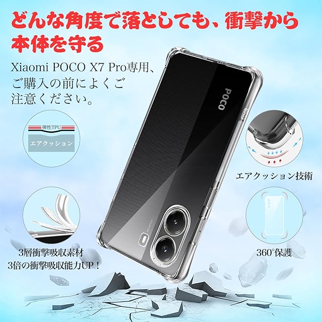 【Xiaomi Poco X7 Pro 専用・衝撃も変形も防ぐ柔軟プロテクション】Xiaomi Poco X7 Pro 専用に設計されたXeokoneクリアケースは、端末にぴったりフィットする高精度3D成形を採用。柔軟性と高弾性を兼ね備えたTPU素材が、落下時の衝撃をしっかり吸収し、360°全方位からスマホをガードします。さらに「衝撃拡散構造」により、一点集中の力を分散し、故障や破損リスクを大幅に軽減。米軍MIL-STD-810G規格に準拠した強度で、日常の通勤・外出・不意の落下も安心。透明デザインでスマホ本来の美しさはそのまま、見た目と実用性を両立した頼れる一枚です。