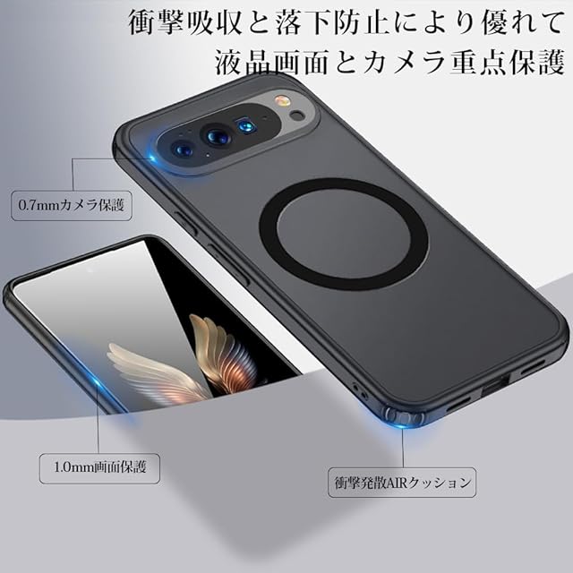 背面はマット加工、高級感と神秘感があります。背面のポリカーボネートは、耐久性や耐摩耗性に優れ、マットな質感でサラサラして触り心地がすごく良いです。シンプルで飽きの来ないマットブラックケースだ。精密機械であいほんの寸法を正確に測量し、誤差の無い1:1のカットアウトを実現。Google pixel 10 Pro XL にぴったり合う。フレームはやや柔らかいTPU素材になっているので、スマホを握った時に手に馴染んで滑りにくく、落としてしまうリスクがかなり軽減される。MagSafeにも対応します。ワイヤレス充電がこれまでよりもすばやく簡単に完了します。