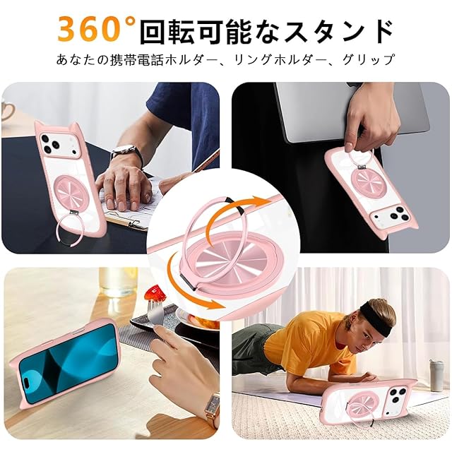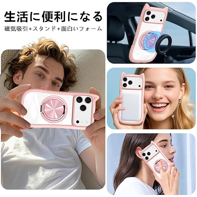 商品名:Denaisii iPhone 17 対応 ケース クリア リング付き 猫耳 ネコミミ しスタンド アイフォン17 スマホケース 360°回転 いphone 17 ケース スタンド スタンド機能 マグネット搭載 透明 iphone 17 対応 カバー 耐衝撃 韓国 可愛くてファッション 全面保護 落下防止 紛失防止(ピンク)