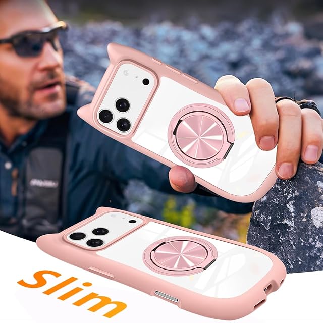 Denaisii iPhone 17 対応 ケース クリア リング付き 猫耳 ネコミミ しスタンド アイフォン17 スマホケース 360°回転 いphone 17 ケース スタンド スタンド機能 マグネット搭載 透明 iphone 17 対応 カバー 耐衝撃 韓国 可愛くてファッション 全面保護 落下防止 紛失防止(ピンク)