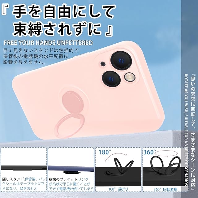iPhone 13 ケース リング付き シリコン 耐衝撃 アイフォン13 リング カバー 全面保護 いphone 13 スマホケース TPU 360°回転 スタンド機能 車載スタンド対応 ストラップホール付き 擦り傷防止 6.1インチ(ピンク)