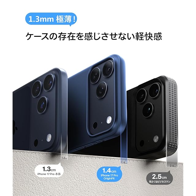 【シンプル設計で、素のiPhoneの握り心地を再現】スマホのサイズに完璧にフィット。端の隙間も最小限で、ホコリや汚れの侵入を防げる。ケースの縁にはG3(人間工学に基づいたエッジの曲線設計で、握り心地が大幅に向上)ラウンド加工を採用し、流線型の美しさを演出すると同時に、握ったときの快適さを大幅に向上させる。極薄設計で、ポケットに入れても全く気にならない。極薄・極軽のケースとシンプルで上質なデザインが、最高の握り心地を実現し、iPhone 17の裸の美しさを最も引き立てる設計である。