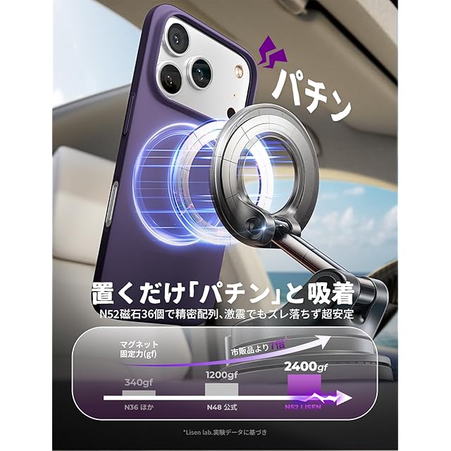 【MagSafe対応・吸着力抜群】 N52強力磁石が内蔵され、精密な計算により最適に配置されています。MagSafe対応の充電器はもちろん、モバイルバッテリーや車載ホルダー、MagSafe対応の財布やカードホルダー、リンググリップなど、あらゆるmagsafeアクセサリーとしっかり吸着。2400gの圧倒的な吸着力で、車載マグホルダーやmagsafe充電時には激しい揺れでも外れず、、安心してお使いいただけます。磁気干渉を抑える特殊設計により、充電効率を最大限に引き出します。毎日の充電を、もっと軽やかに、もっと安心に。